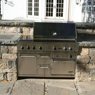 Stone planters, a grill surround and a combination retaining wall and bench made from stone remnants.